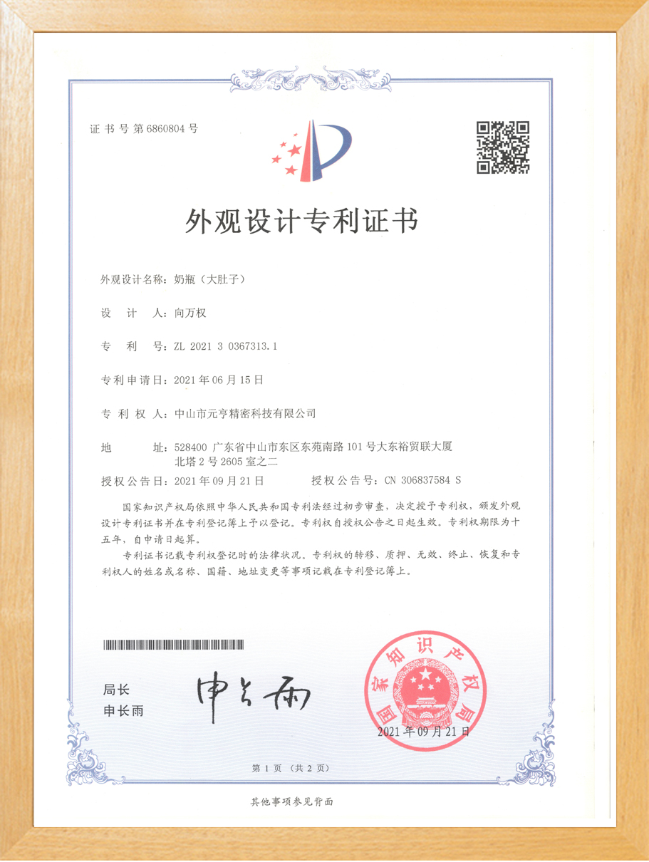 元亨精密-奶瓶(大肚子)--外观设计专利证书